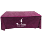 Four-sided table cover creates a lasting impression. Simple storage. Closed back makes it easy to hide materials underneath table. This table cloth will fit a standard 6' table. Compliant with flame retardants for exhibit halls. Price includes full color sublimation. Max Imprint: New Size: 128" x 86"L. Usage: Presentations, trade shows, retail stores, events, school functions, fundraisers.