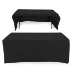 - Drape style table cover, simple storage. Closed back gives more privacy. Washable and reusable. This item is a tradeshow favorite.