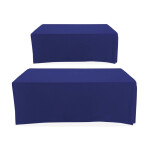 Three-sided table cover creates a lasting impression. Simple storage. Open back makes it easy to store materials underneath table. This table cloth will fit a standard 8' table. Compliant with flame retardants for exhibit halls. Usage: Presentations, trade shows, retail stores, events, school functions, fundraisers. Price includes full color sublimation. Max Imprint: 152"W x 60"H.