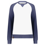 * 7.6 ounce 55% polyester/41% cotton/4% rayon, super soft fleece * Ladies' fit * Woven label * Exterior faux leather logo loop label * Contrast color V insert at center front neck * Raglan sleeves * Rib-knit collar, cuffs and bottom band